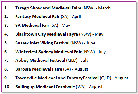 Australia has Medieval Festivals in every State for fans to attend, with many participants travelling thousands of kilometres to get there. Here are 10 notable ones to explore with more to find at Australian Medieval Fair Calendar – 2024 – Mainly Medieval.