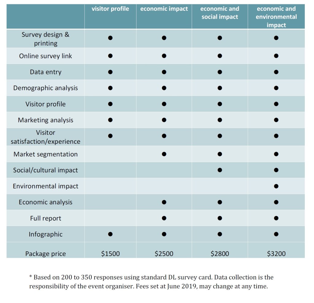 Packages start from AUD$1500 for a visitor profile or visitor experience study, up to $3000 for an economic and social impact study.