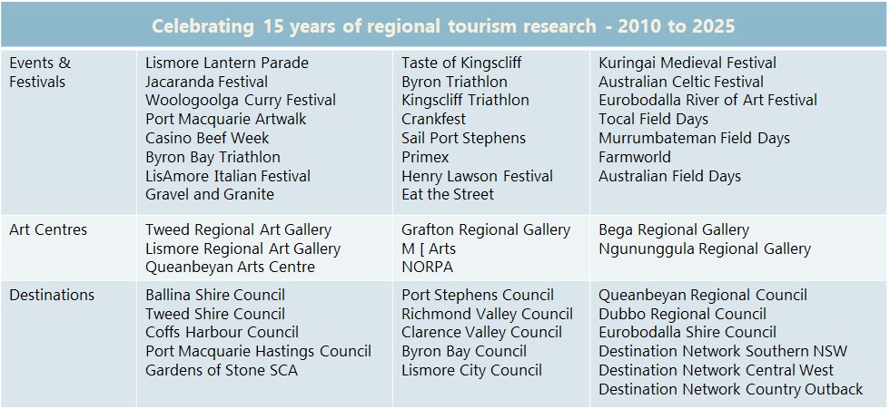 This year we celebrate 15 years of specialist research in cultural tourism. We are looking back at our projects for regional art galleries, festival and events that have provided new insights into the needs and travel behaviours of visitors, as well as measuring the economic impact to the local community.