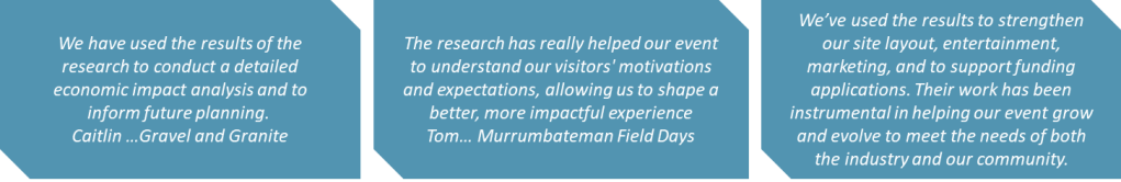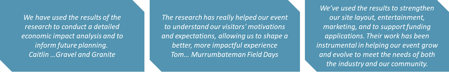 We specialise in research and evaluation for regional events, galleries and sports venues with a proven record in securing funding and sponsorship. We have proudly served over 80 regional events in NSW and QLD with research services in social, economic and tourism analysis.